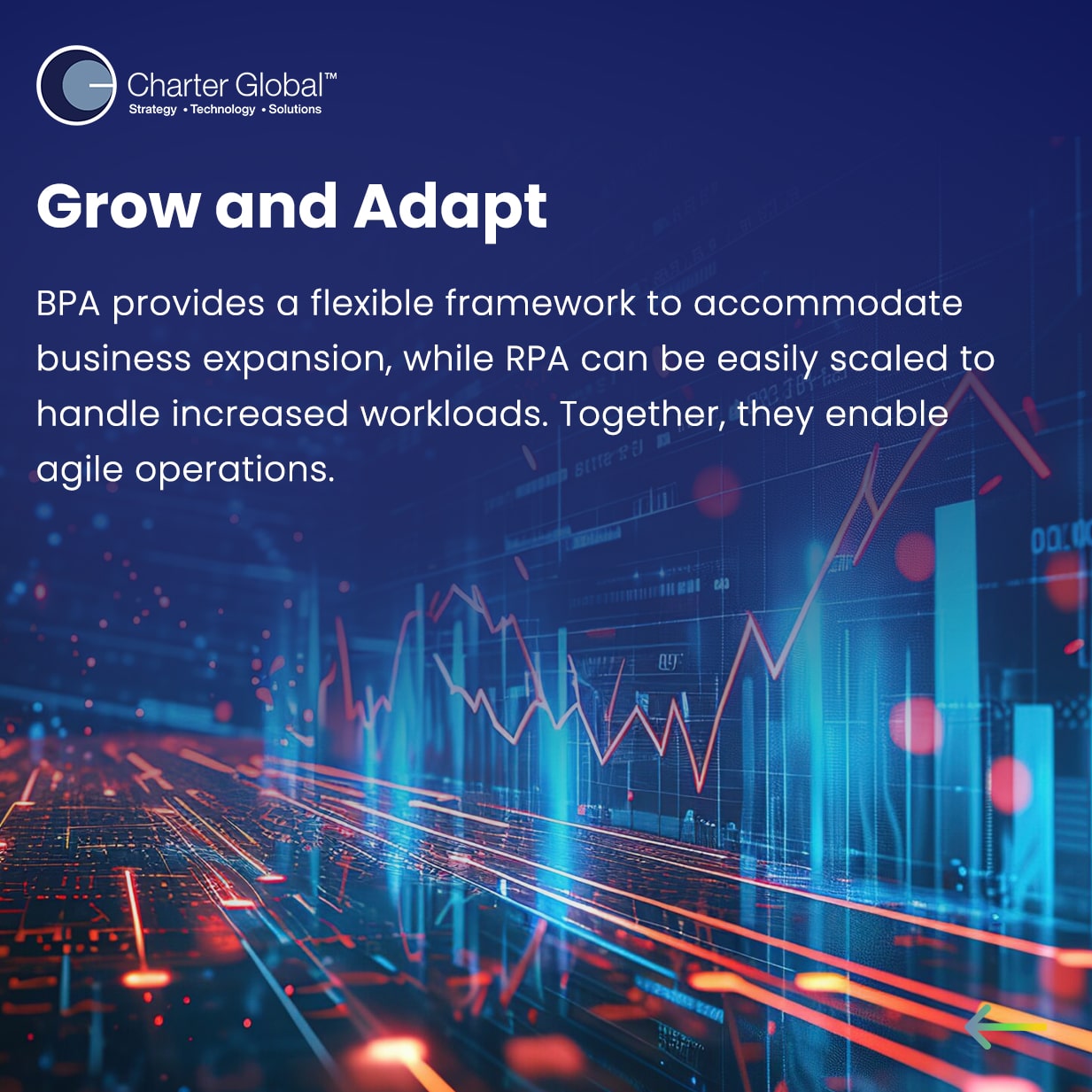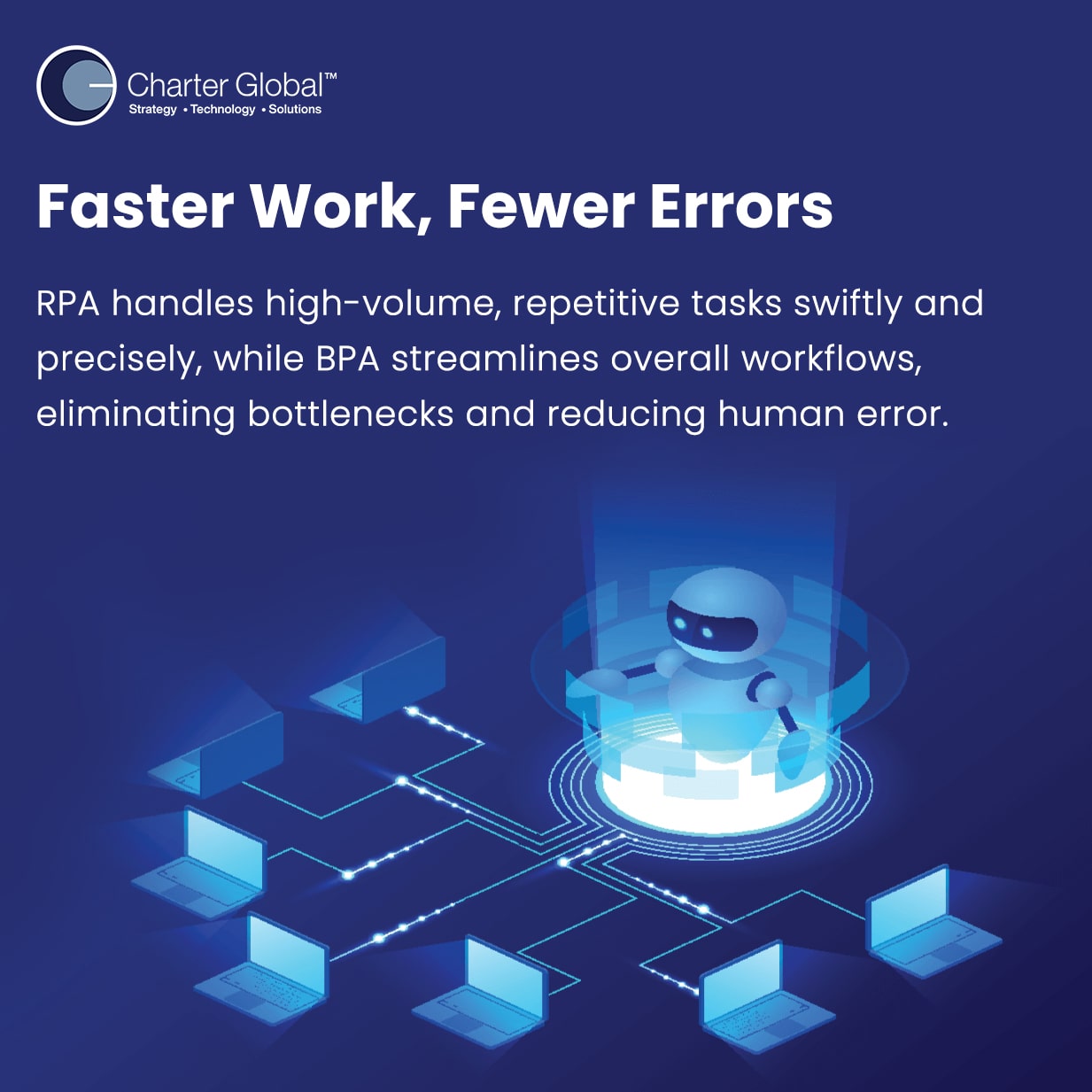 To integrate RPA and BPA effectively, start by identifying key processes that could benefit from automation. Consult with experts to evaluate your workflows and find the best ways to integrate these technologies for maximum impact. Charter Global provides tailored solutions to help you design, implement, and optimize your RPA and BPA strategies.