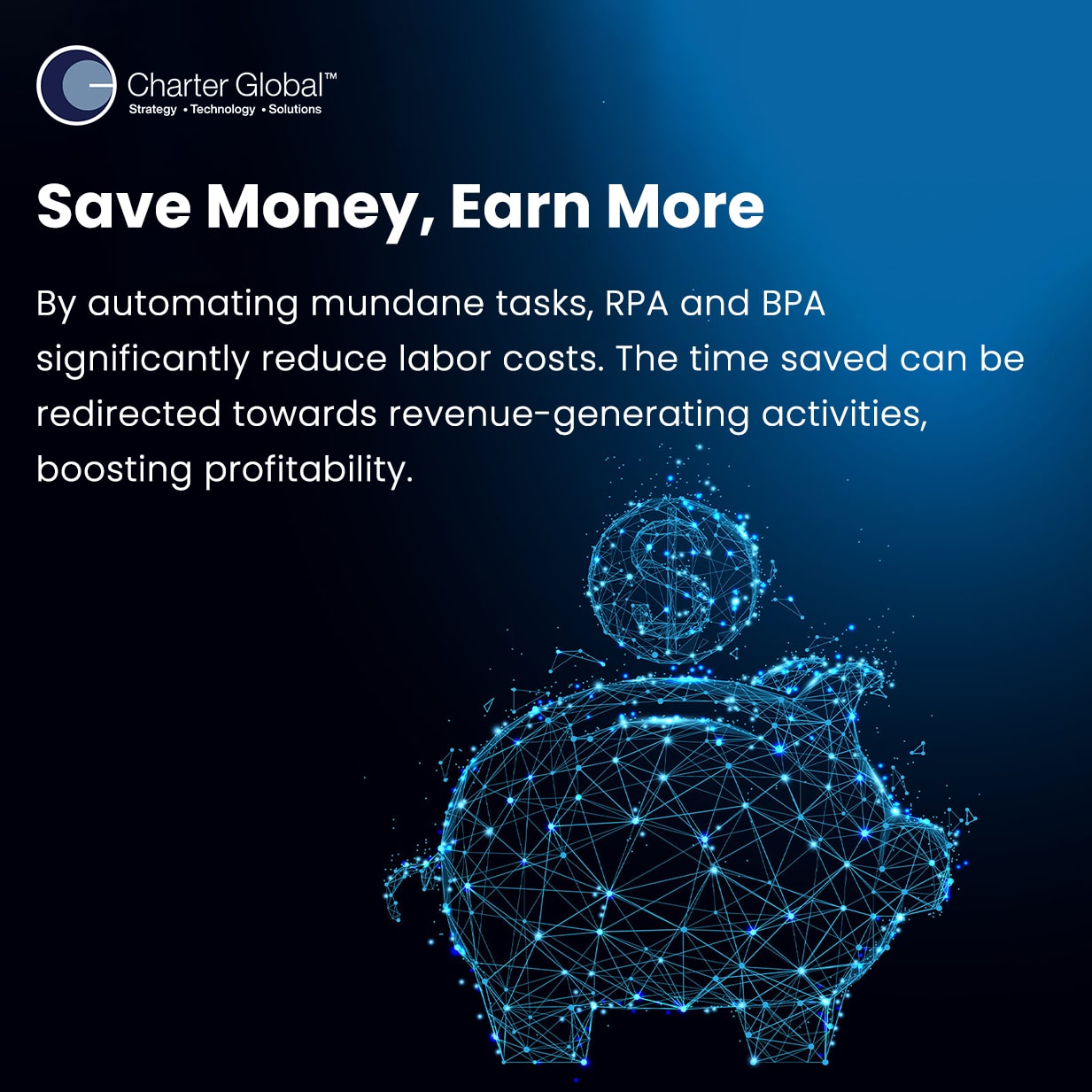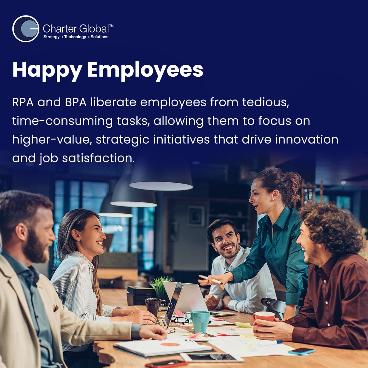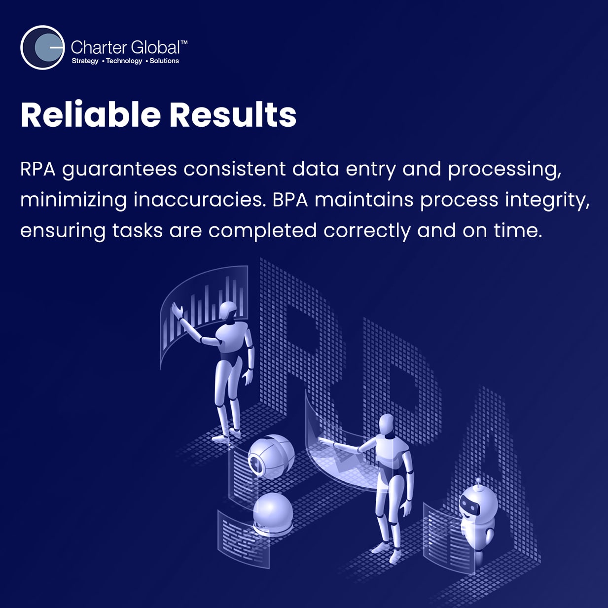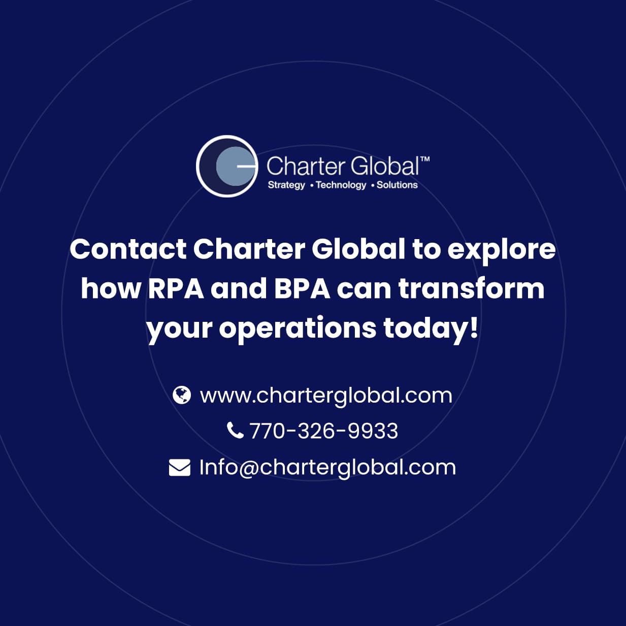 For more information on how Charter Global can help you integrate RPA and BPA into your business processes, contact us today. You can also email us at sales@charterglobal.com or call +1 770.326.9933. Let’s transform your organization together.